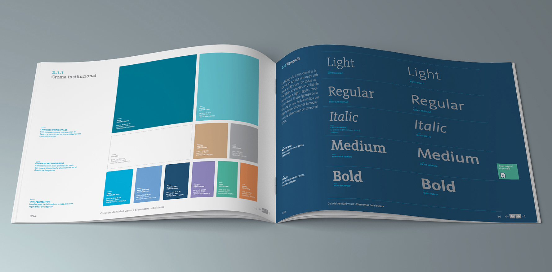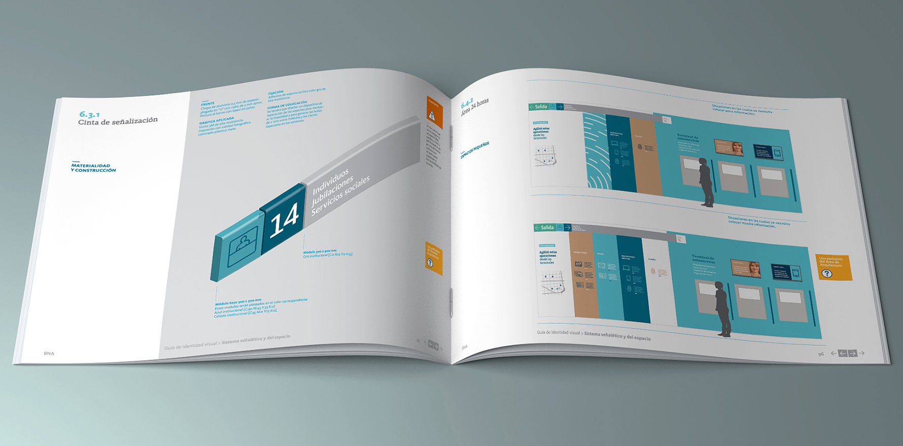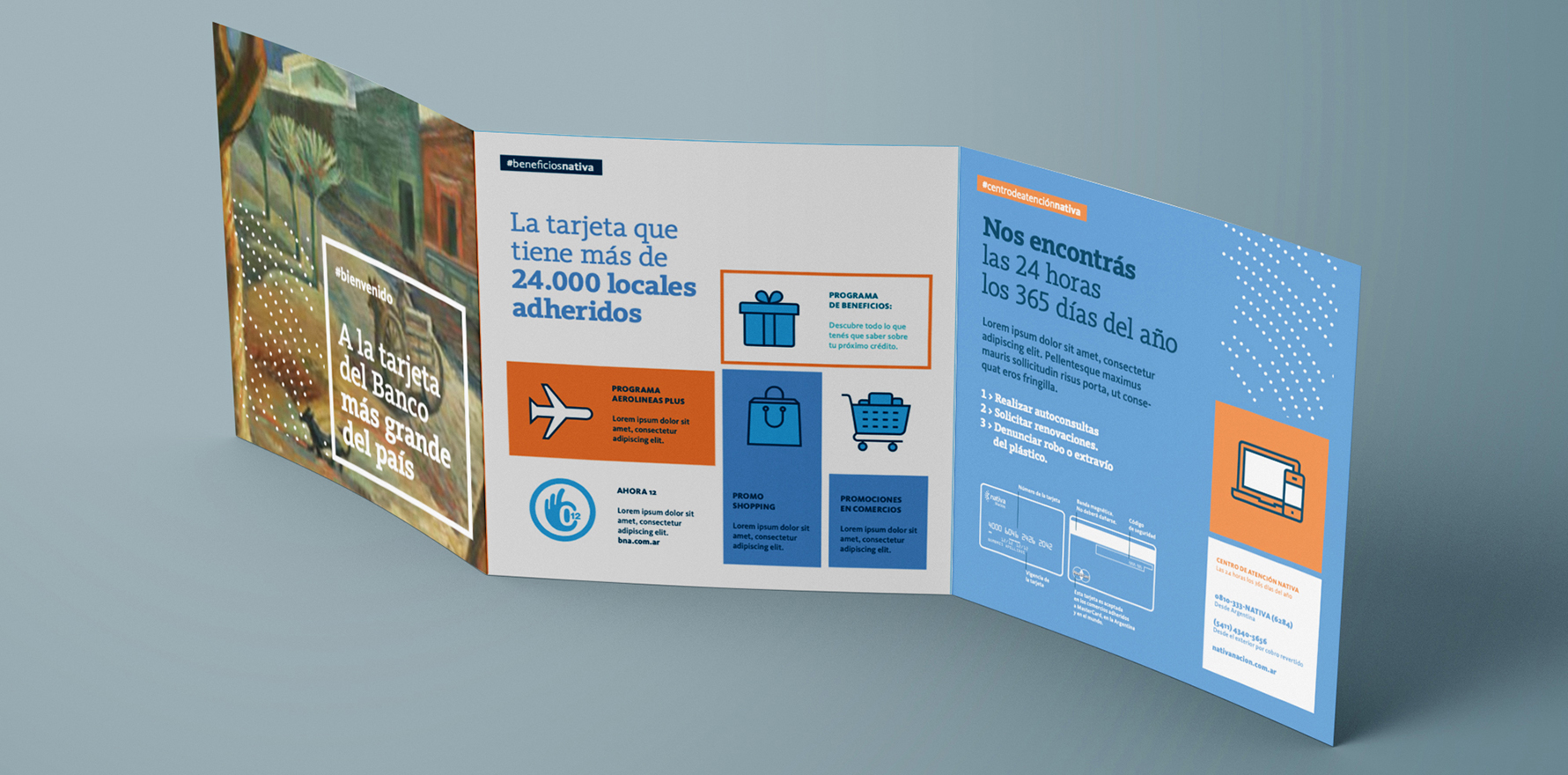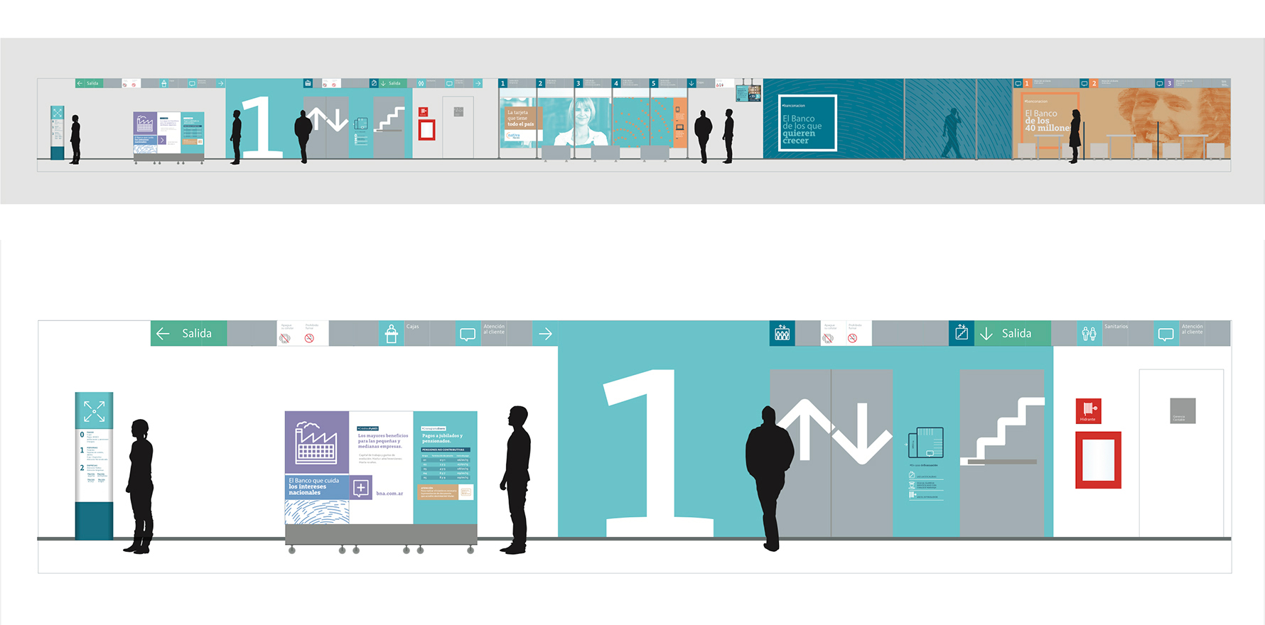 Desarrollamos cada uno de los puntos de contacto entre la institución y el público, desde los espacios físicos hasta los materiales gráficos. La nueva marca gráfica es responsiva y la sigla BNA mantiene el reconocimiento al tiempo que permite un mejor uso del espacio y opera mejor en los soportes móviles. Se completa con el eslógan “PRESENTE” que da cuenta del perfil del Banco: Estado presente desde su función social; amplia y creciente presencia territorial; permanencia en el país; vocación proactiva de servicio. El sistema de identificación visual, se actualizó a través de una redefinición de la paleta cromática, un planteo estructural afín a los soportes digitales y el rediseño de todos los materiales como folletería institucional y publicitaria, plásticos (más de veinte variedades de tarjetas), formularios, afiches y gigantografías, promociones y beneficios, etc. Se intervino también en las sucursales, desde las cenefas hasta el diseño de mobiliario; incluyendo fachadas, señalética, área 24hs., ambientación, mamparas y soportes informativos. El sistema señalético fue concebido para ser aplicado en soportes de enorme diversidad dado lo disímil de las sucursales a lo largo del país, incluyendo edificios históricos.