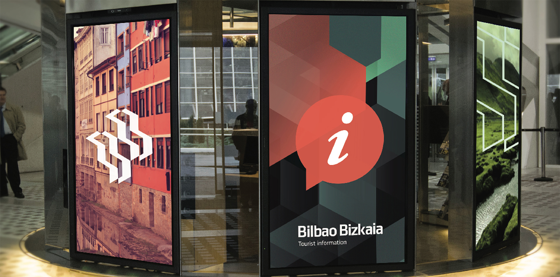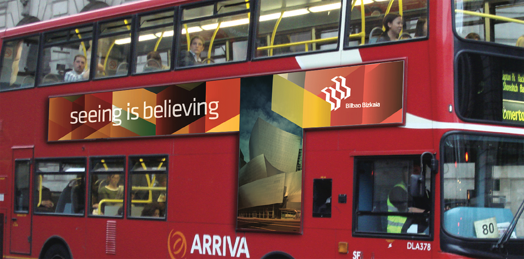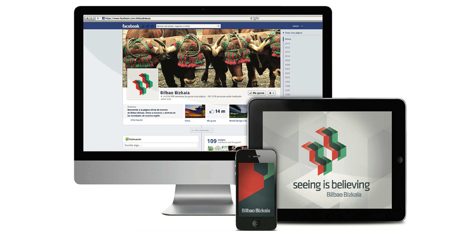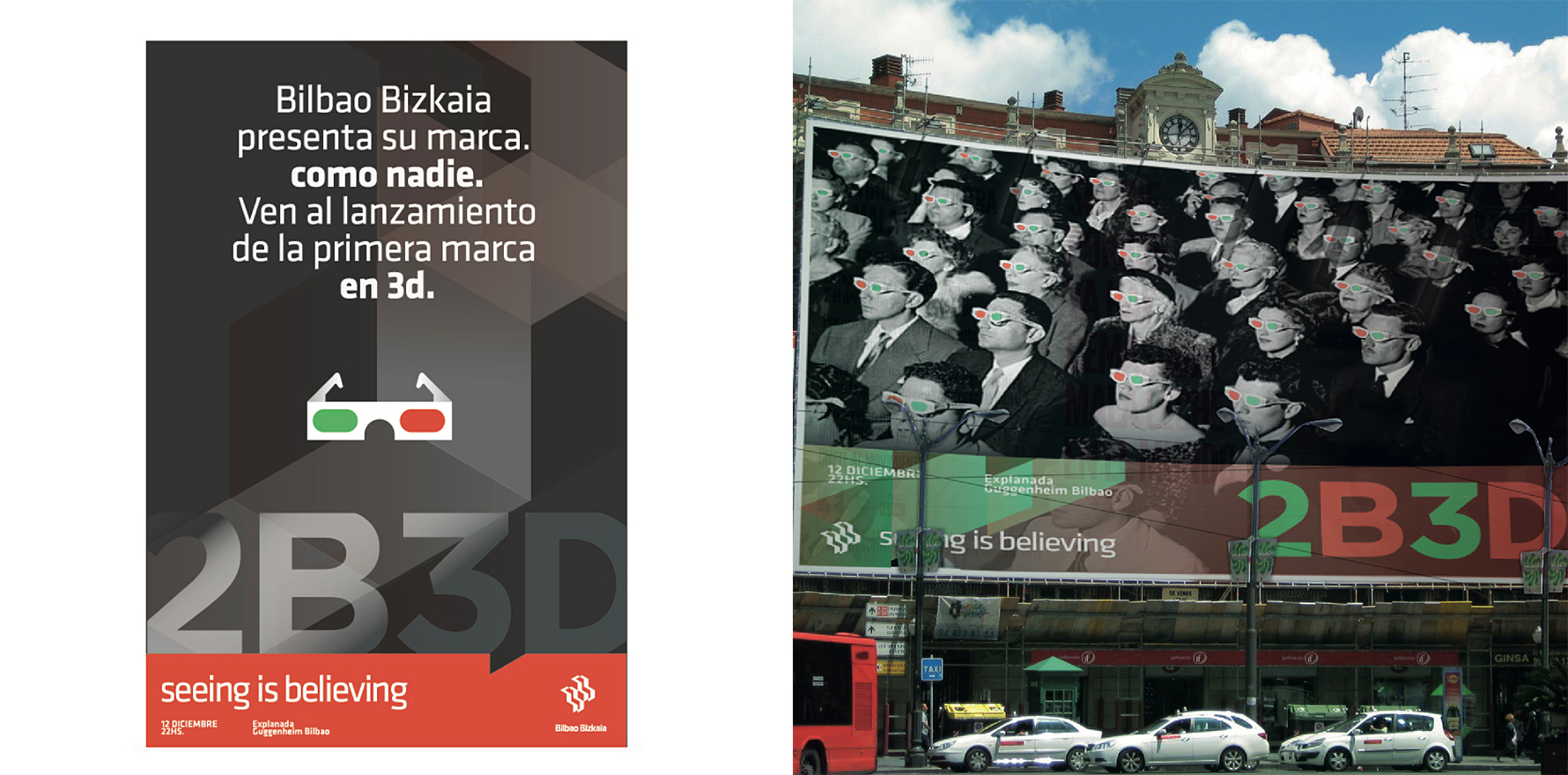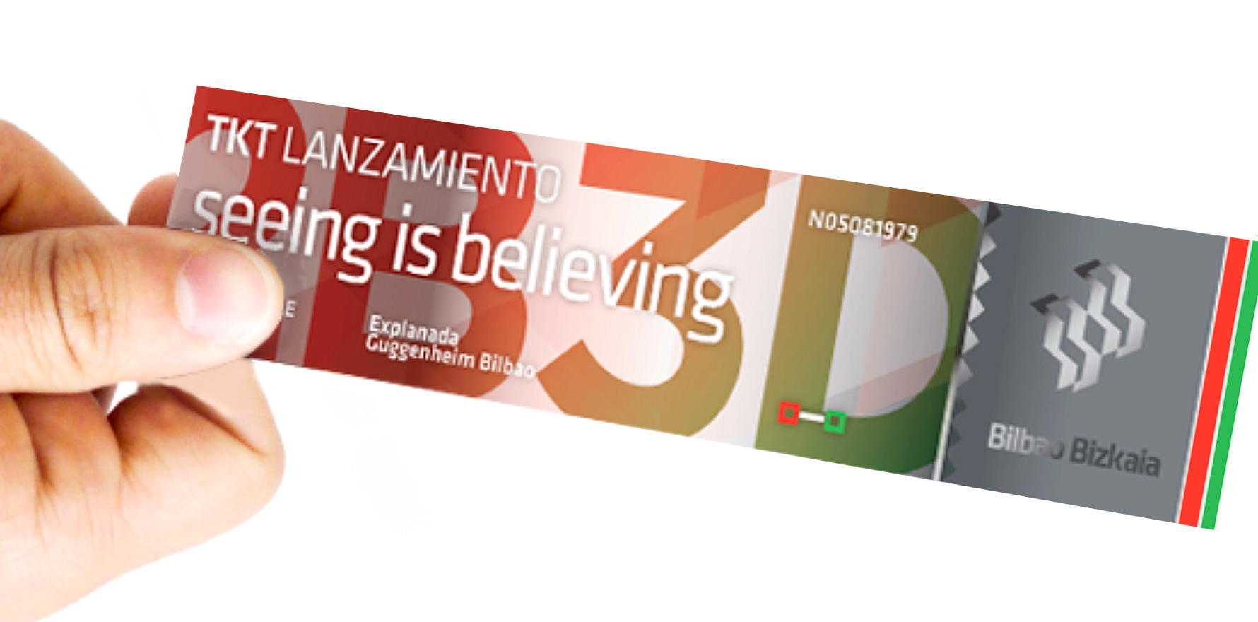 Decidimos crear un símbolo con los colores del país vasco que puede desdoblarse en dos, uno para cada destino. Por las características morfológicas y cromáticas lo vimos apto para generarle volumen en 3D coincidiendo con el fuerte rasgo de arquitectura moderna y osada que caracteriza a Bilbao. El eslogan general seeing is believing (ver para creer) remite al asombro que la ciudad produce en sus visitantes y la necesidad de verla personalmente y se desdobla como seeing is beloving para la experiencia cultural de Bizkaia.