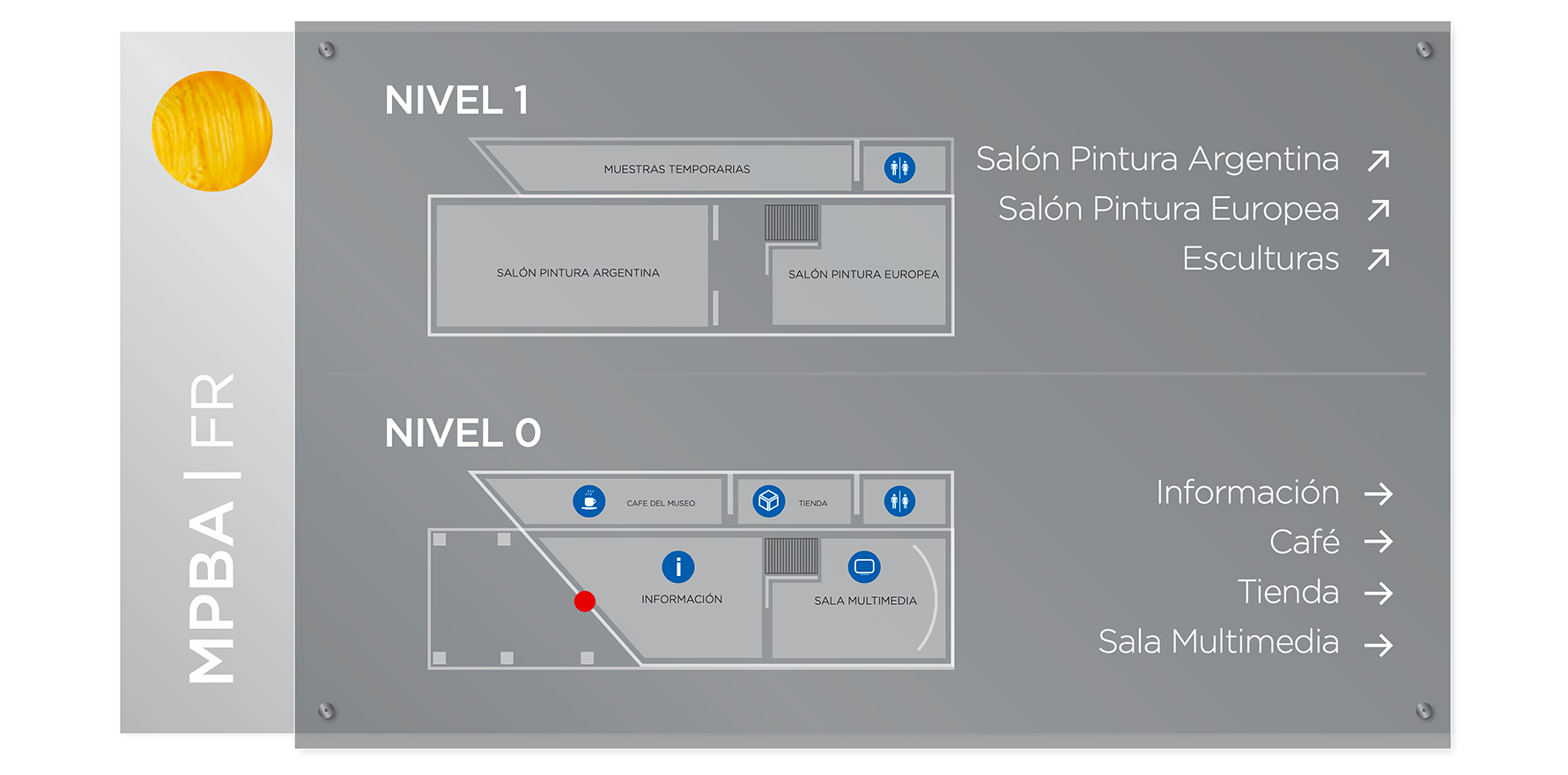 Se generó una identificación que fuera tan local (el sol sintetizado) como universal (el punto como unidad mínima de la imagen) con un tratamiento minimalista y moderno que se integra perfectamente con el edificio. Además del sistema de identificación y su comunicación se desarrollaron también la señalización interna y los elementos para el gift shop.