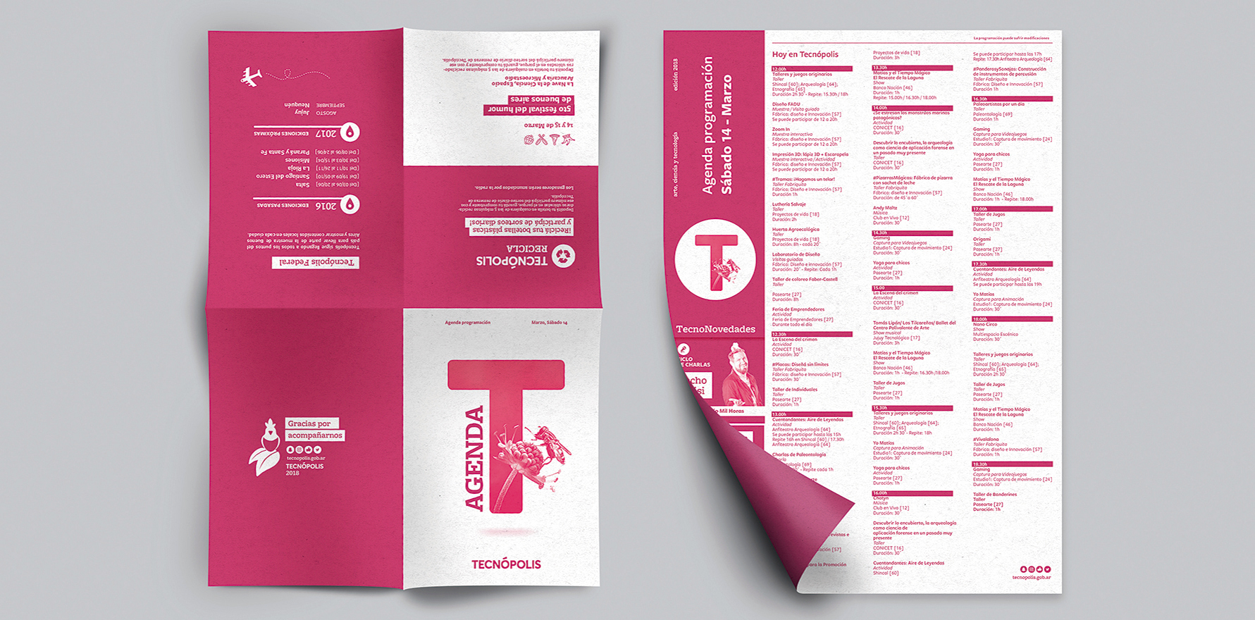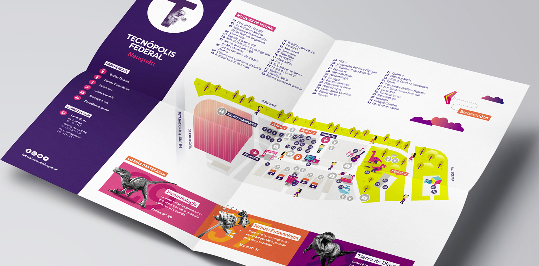 Desarrollamos integralmente la comunicación de la muestra desde las intervenciones de gran escala hasta las credenciales de acreditación. Definimos una paleta cromática alejada de cualquier connotación partidaria y lo suficientemente potente como para funcionar en un parque de sesenta hectáreas saturado de estímulos. Se generaron subsistemas cromáticos para la segmentación por temas, junto con un pack de ilustraciones específico para los contenidos de la muestra. Se rediseñó el logotipo y sistema de identidad incluyendo tramas, paleta cromática y sistema de firmas; banners para campañas de difusión y eventos puntuales; sistema señalético y orientadores; materiales de mano; cercos perimetrales; kioscos de información y de gastronomía; afiches temáticos e informativos; intervenciones sobre grandes espacios arquitectónicos; y la respectiva normatización de todos los materiales así como la comunicación de los innjumerables espectáculos que pasaron por el predio. Dado que la muestra tiene un carácter temático que se modifica cada año, el sistema se actualizó periódicamente incorporando nuevas piezas e liustraciones en cada una de las ediciones y desarrollando sistemas iconográficos específicos para cada una de las ciudades visitadas. Tecnópolis alcanzó los 10MM de visitantes en su sede original y casi cinco millones más en las nueve provincias en las que se presentó de modo itinerante.