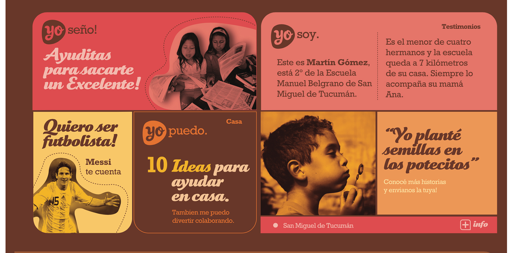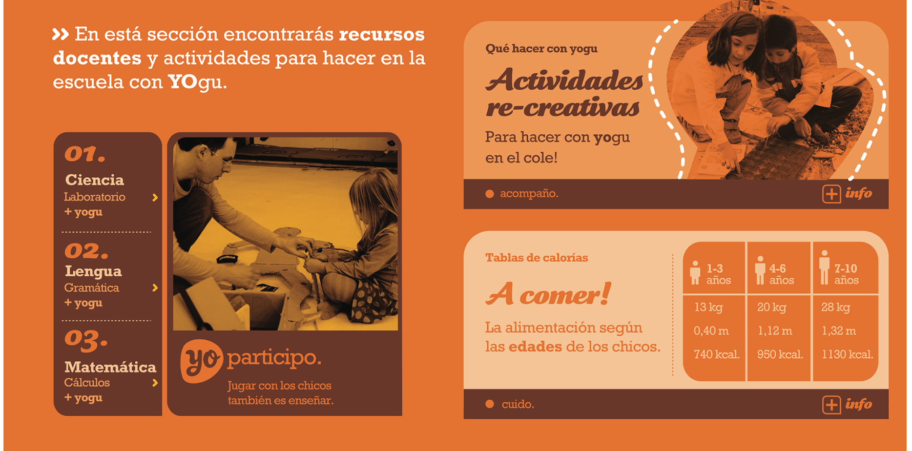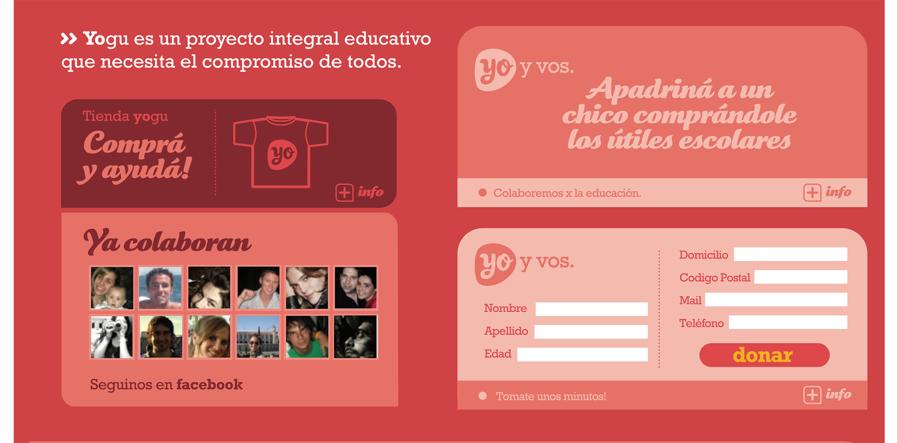 Tratándose de niños que requieren particularmente de la autovaloración y protagonismo social replanteamos el nombre potenciando el YO. Mientras Yo es el nombre general del proyecto, el producto pasa a llamarse yogu y la marca registrada queda como yoguR. Así se elimina el diminutvo que peca tanto de facilismo infantil como de devaluar el producto, que en todo caso es un “yogurazo”. El eslogan “mejor para todos” completa la idea integrando educadores, estudiantes y comunidad. Se creó también una plataforma digital. Considerando el escaso acceso y disponibilidad de conectividad no está dirigida a los chicos sino a la comunidad y los docentes. Los chicos son protagonistas pero sus historias personales van dirigidas a humanizar y perosnalizar la situación para poner en evidencia el destino de las donaciones. La plataforma posee una tienda online (con el yo-yogu como producto estrella) y permite otras formas de colaborar como donaciones, patrocinio, ediciones limitadas de indumentaria y acuerdos de cobranding con otras marcas nacionales.