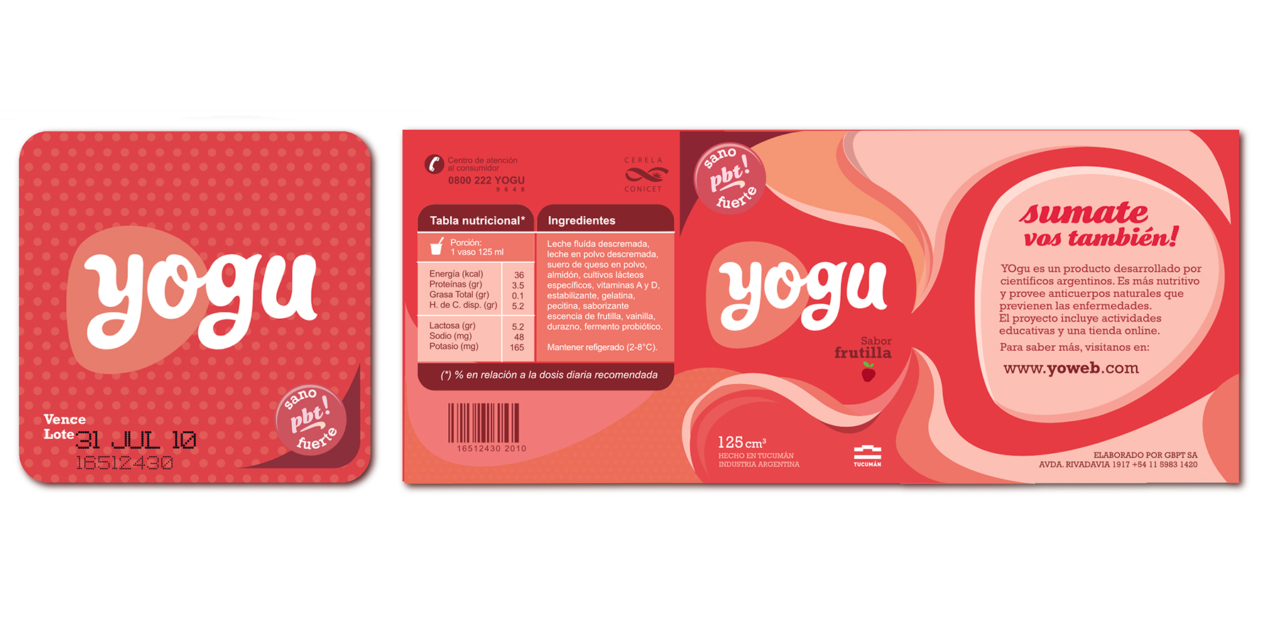 El Centro de Referencia para Lactobacilos del CONICET desarolló un yogur probiótico con mayor capacidad nutricional y anticuerpos naturales para distribuir en las escuelas públicas de la provincia de Tucumán. Se denominaba “yogurito” y contaba con un packaging bastante objetable que puede verse en las imágenes. Partiendo de ese innovador producto desarrollamos todo un entorno comunicacional para potenciarlo.